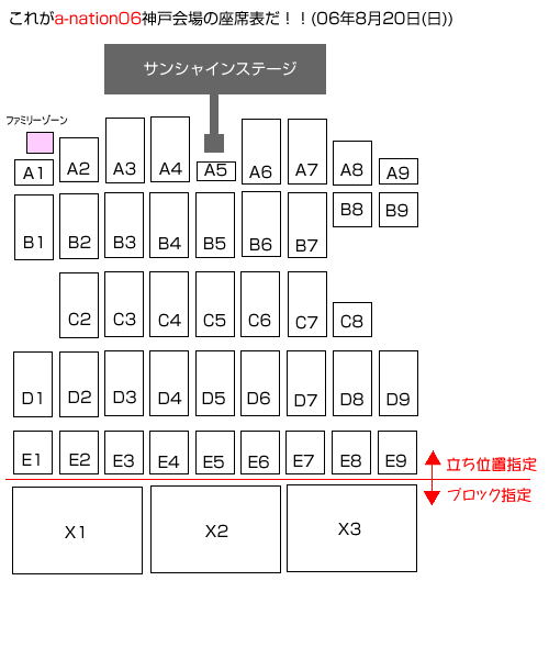 上の図は、2006年8月20日(日曜日)a-nation06神戸 2日目の座席表です。 「立ち位置指定」と「ブロック指定」とありますが、この違いは、公式HPによると・・・ ☆立ち位置指定☆