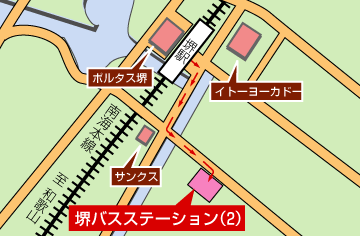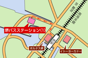 「シャトルバスのりば(2)」へは、まず堺駅の東出口を使います。