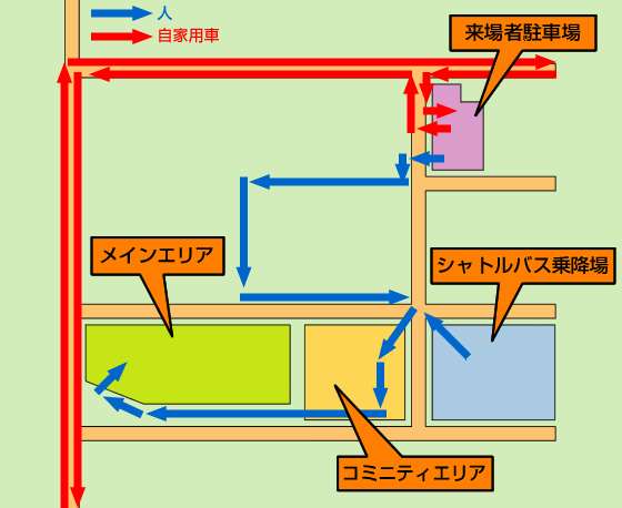 行ったときは、全員シャトルバス(1)の方向に誘導された。