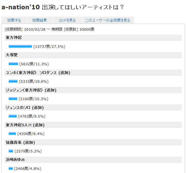 投票第1弾、「a-nation'10 出演してほしいアーティストは?」が4月初旬に50,000票を超えました!只今も続々投票いただいております!ありがとうございます!!