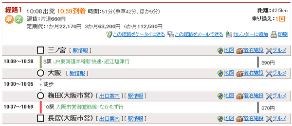 10:08出発10:59到着 到着時間:51分(乗車42分、ほか9分) 三ノ宮10:08→(JR東海道本線新快速・敦賀行)→大阪10:28 |