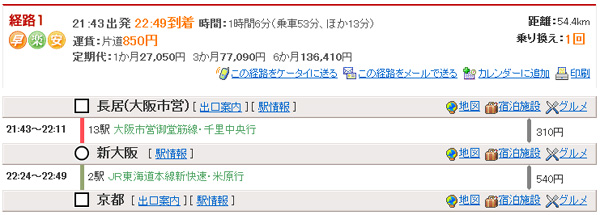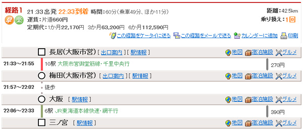 21:33出発22:33 到着時間:60分(乗車49分、ほか11分) 長居21:33→(地下鉄御堂筋線・千里中央行)→梅田21:55 |