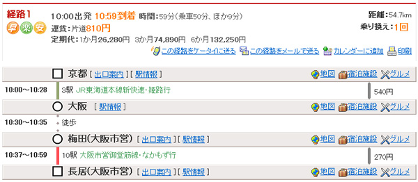 10:00出発10:59到着 時間:59分(乗車50分、ほか9分) JR京都10:00→(JR東海道本線新快速・姫路行)→大阪10:28 |