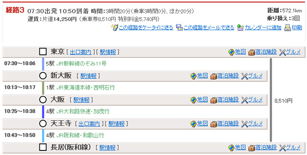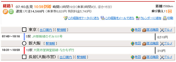 ※新大阪から地下鉄を使って最寄り駅に行く方法です。 07:40出発10:59到着 時間:3時間19分(乗車3時間4分、ほか15分) ・東京7:40→(新幹線のぞみ101号)→新大阪10:16 |