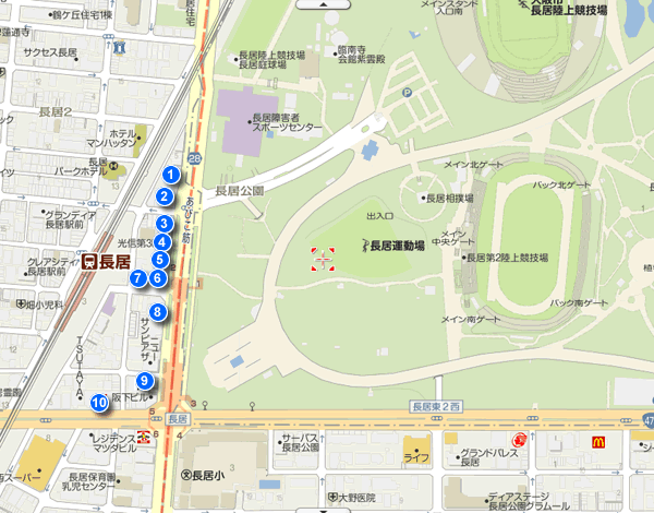長居スタジアムは住宅街にあります。そのため、食べ物屋が長居スタジアム周辺に多くあります。