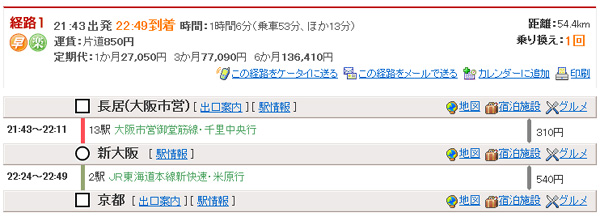 長居21:43→(地下鉄御堂筋線・千里中央行)→新大阪22:11