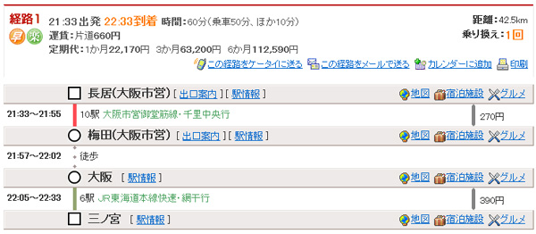 長居21:33→(地下鉄御堂筋線・千里中央行)→梅田21:55