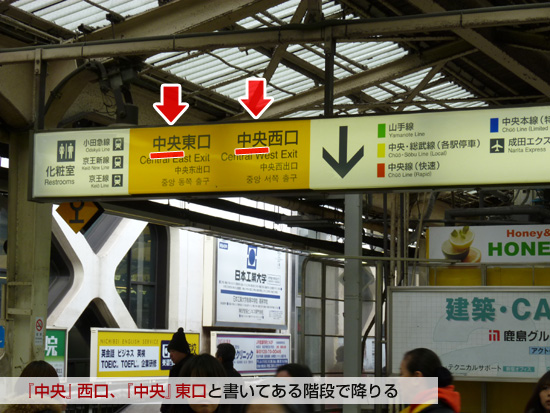 『中央』と書いていない普通の「西口」、「東口」の階段に降りると、違うところに出てしまう可能性が