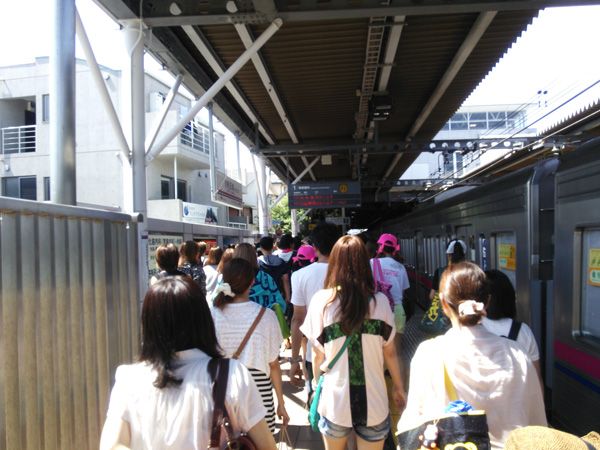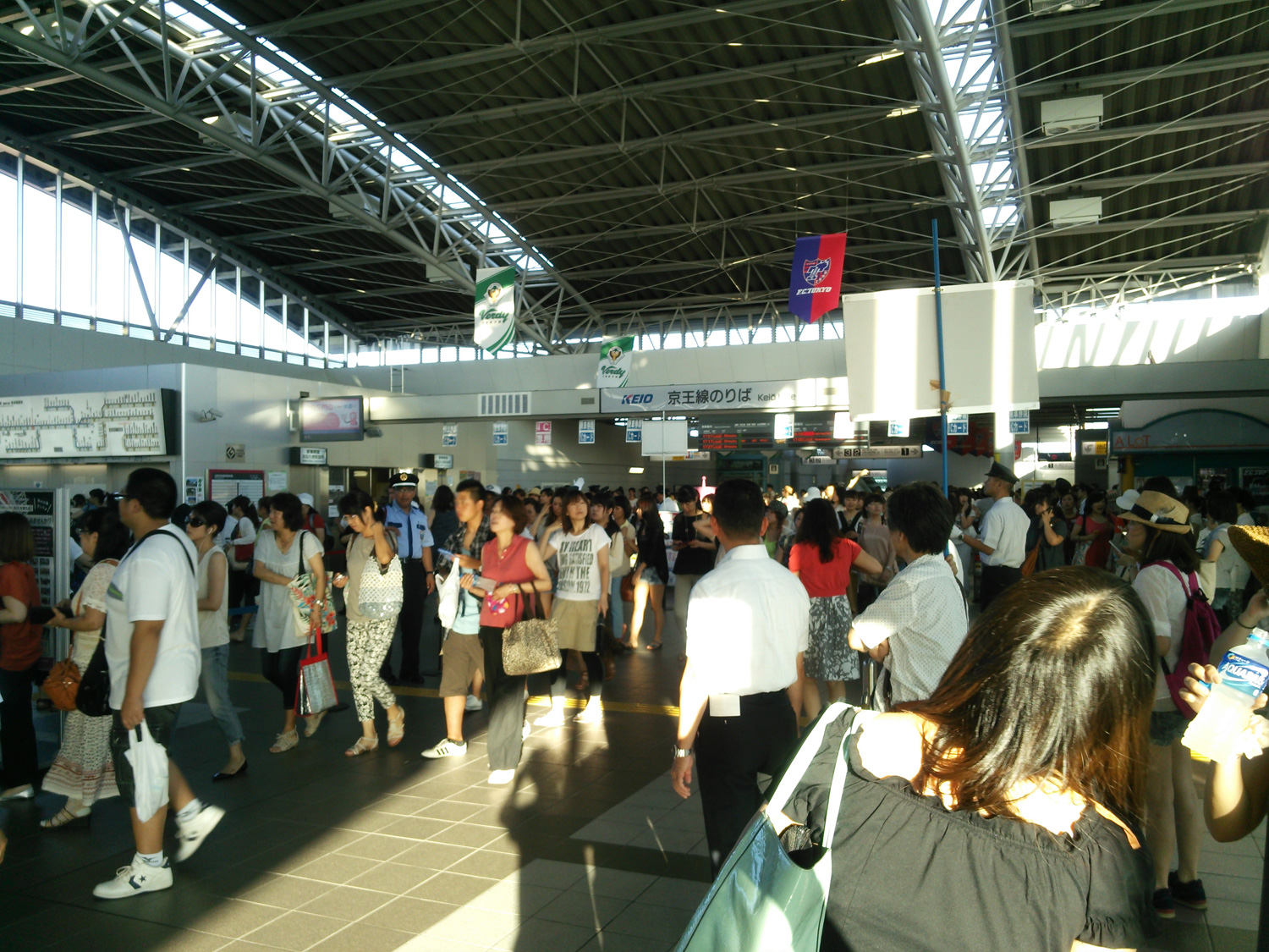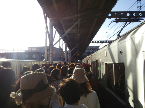 夕方5時なのにすごい人!駅員が懸命に誘導していました。