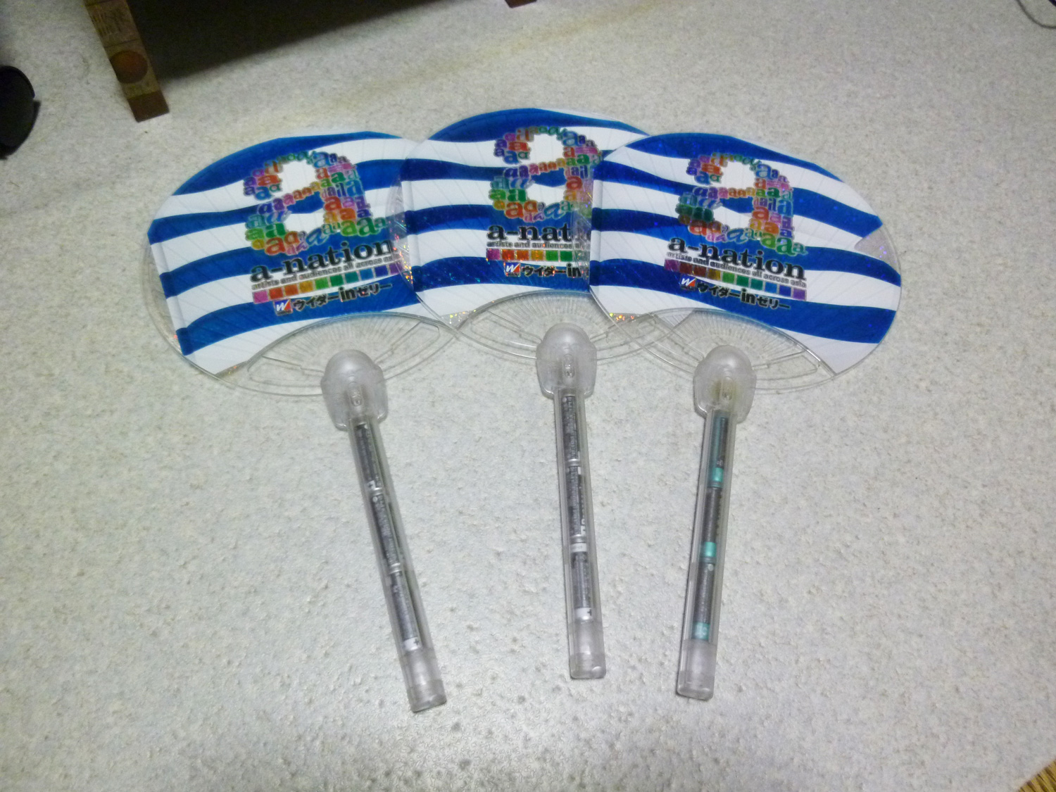■お客様もすごい! おまけですが、僕の近くにいていた『a-nationお客様の鏡』と思われる男性がいて、 どのアーティストも光るうちわを大きく振っていて応援していました。 6時間ずーーーっとですよ!! しかも光るうちわ2つ持ちw!! おそらく前日にも来られていたのでしょう。