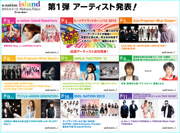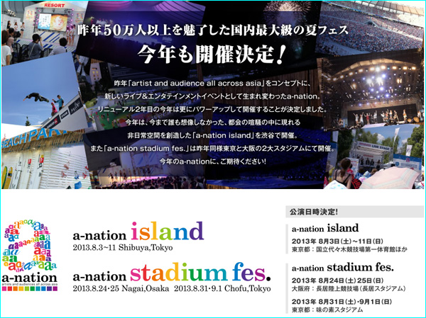 a-nation 2013 8/11は三代目JSB、m-floなど出演「音祭り2013」!