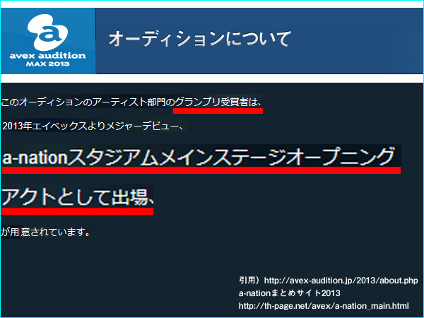 トップページ にも大きく、「グランプリには、2013年度メジャーデビュー&a-nation出場。」