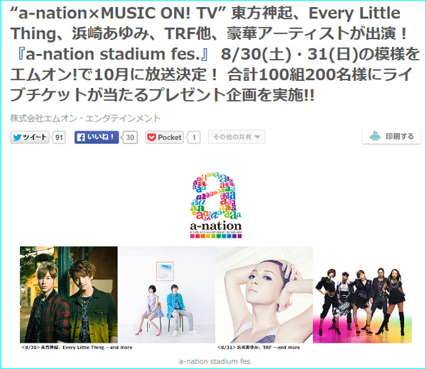 8/18(月):a-nation 2014 stadium fes.STアーティスト第2弾のアナウンスがされる!