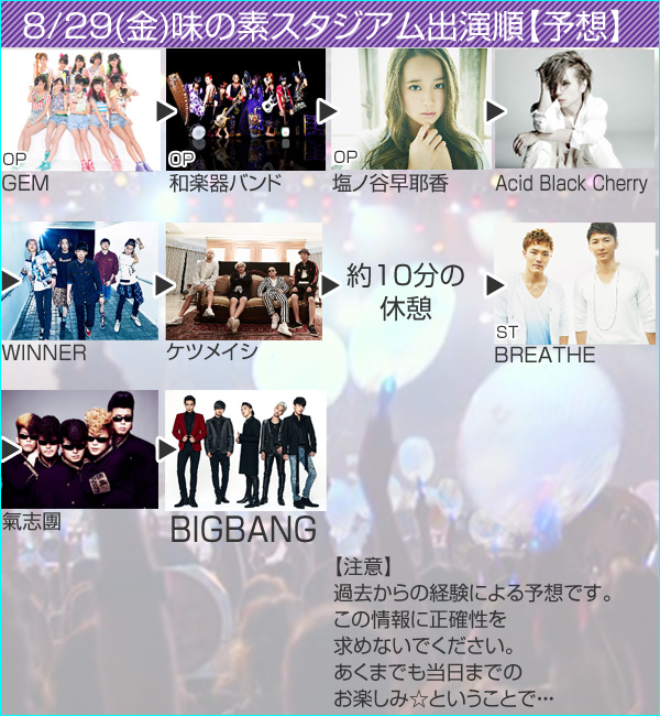 WINNER→氣志團→ケツメイシ→ABC→EXILE TRIBE→BIGBANG。