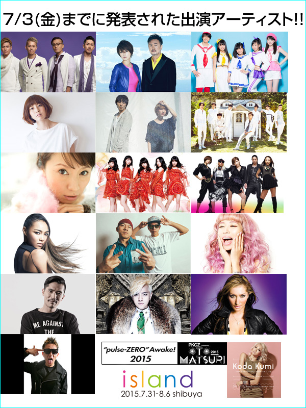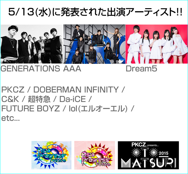2015年5月13日(水)、渋谷で開催されるタウンフェス 7月31日(金)17:30から「OTO_MATSURI 2015」が開催! ※「PKCZ」とは、この企画を立ち上げたVERBALが、 8月6日(木)17:30から「AsiaProgress〜Twinkle〜」が開催! 8月6日(水)13:00から「AsiaProgress 〜Future〜」が開催! となっています。 ※アーティスト一覧をわかりやすくまとめました! 先行チケットも発売開始しました! これから次々と、公演、アーティスト、チケットなど発表されていくと 新しい情報が入り次第、このページでまとめていきます!