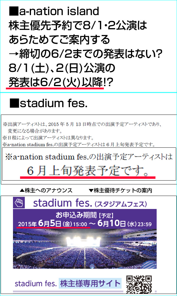 ■1■islandセブンイレブン系チケット発売開始! 2015年5月21日(木)、「a-nation island」のうち、 Yahoo!プレミアムチケットはすでに販売開始、終了しました。 しかし、このチケットはnanaco以外は基本、だれでも購入が可能! 大多数の人はこのチケットが また、運にもよりますが、 こちらのチケットは【抽選制】なので、 ■2■stadium fes. 6/5(金)までに出演者の発表あり!? また、株主優待チケットの案内もあったようで、 ということはstadium fes.は、6月5日までには必ず発表がある!? 株主優待チケットが最先行チケットになるとは限らないので これからは6月上旬まで情報に要チェックですね!
