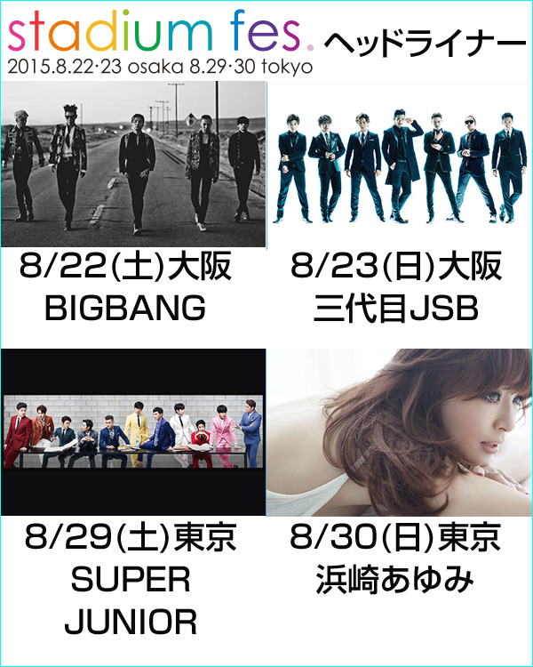 6月12日(金)、ついにstadium fes.出演者第1弾が 8月22日(土)大阪公演は、 8月23日(日)大阪公演は、 8月29日(土)東京公演は、 8月30日(日)東京公演は、 また、ヘッドライナーは、 ※ヘッドライナー:合同で行われるコンサートで主役を務める、という意味です。 >アーティスト一覧まとめました!公演別の一覧も! なお、出演者は第1弾だけでなく、