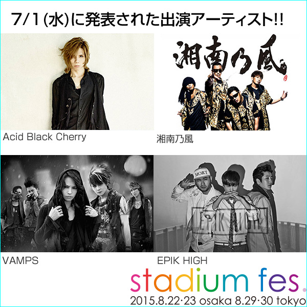 2015年7月1日(水)、公式HPにて 8/22(土)大阪1日目には、EPIK HIGH(エピック・ハイ)が! 8/23(日)大阪2日目には、Acid Black Cherryと湘南乃風が! 8/29(土)東京1日目には、VAMPSが! 8/30(日)東京2日目には、Acid Black Cherryが登場! 8/22(土)は8組が、8/23(日)は7組が、 時間的なことを考えるとメインアーティストは8組くらいが しかし!8/29(土)はまだ5組! まだまだ、あの気になるアーティストの出演が また、同日に公式HP先行チケットの申し込みも始まりましたので、