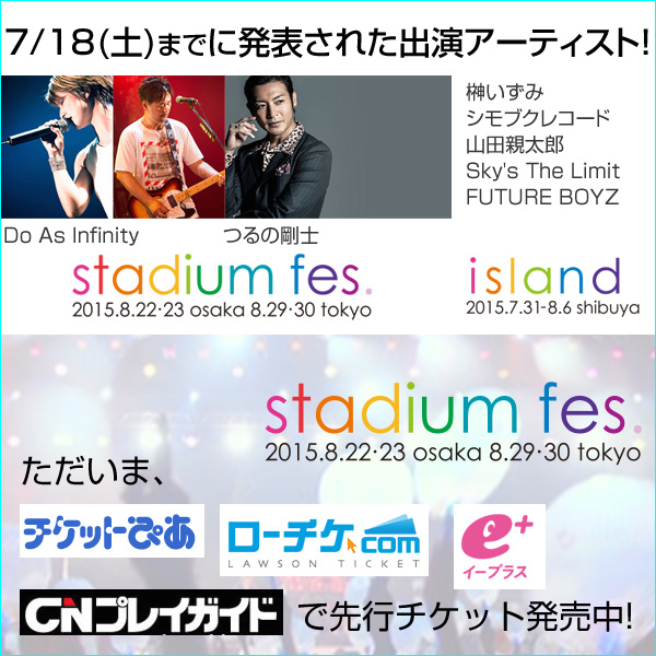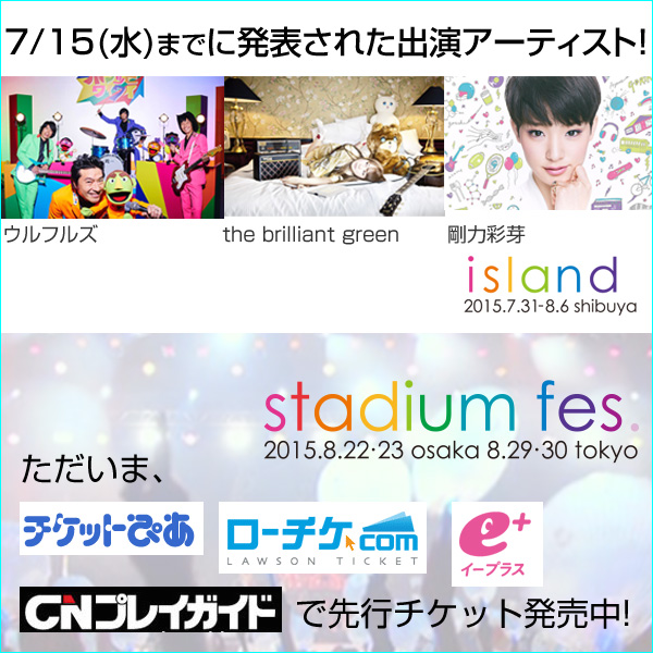 island公演、続々と追加アーティストが発表されています! ウルフルズ!剛力彩芽!the brilliant green! それぞれ、違う公演に出演となっていますので、 そして、一般発売も始まり、公演によっては、 そして、stadium fes.では、チケットぴあなどで 8月1日(土)10:00からの一般発売の前に まだチケットゲットできるチャンスありますよ!