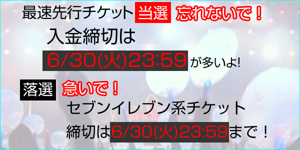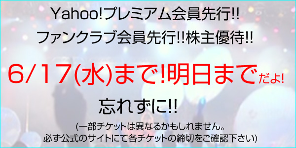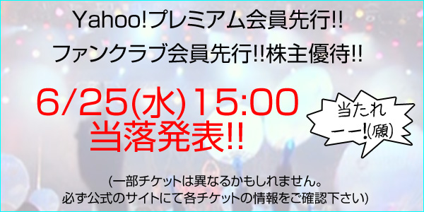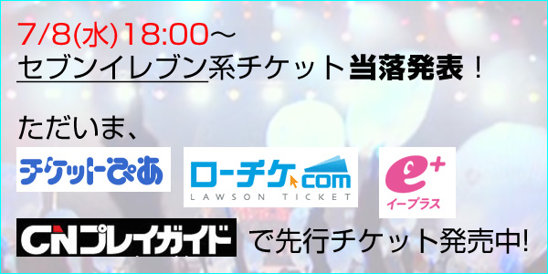 2015年7月8日、セブンイレブン系チケットの ファンクラブやYahoo!会員、株主以外の方なら 結果発表時間は18時以降なので、 そして、「チケットぴあ」など今までのチケット発売場所でも まだチケットがゲットできていない人、 ■7/8追記 チケットぴあ、大阪公演の先行チケット情報を追加!