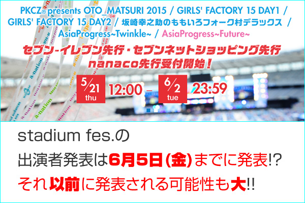 ■stadium fes.の公式HP先行チケット締切迫る! stadium fes.の公式HP先行チケットの セブンイレブン系チケットを申し込んでいる人は、 また、ローチケやe+、CNプレイガイドでも こちらのチケットは狙い目かも!?