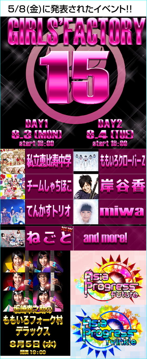 8月3日(月)18:00から「GIRLS' FACTORY 15 DAY1」が開催! 8月4日(火)18:00から「GIRLS' FACTORY 15 DAY2」が開催! 8月5日(水)19:00から「ももいろフォーク村デラックス」が開催! となっています。 ※アーティスト一覧をわかりやすくまとめました! 3日ともすべて「a-nation」と提携している また、8月6日(木)は代々木第一と第二体育館で 先行チケットも発売開始しました! これから次々と、公演、アーティスト、チケットなど発表されていくと 新しい情報が入り次第、このページでまとめていきます!