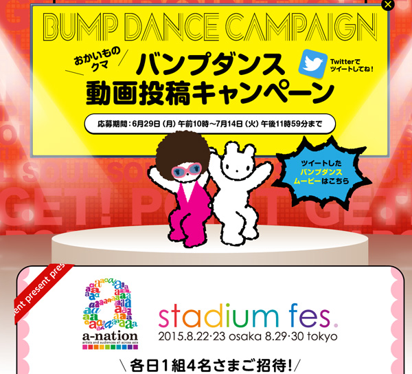 ■stadium fes.チケットがあたるキャンペーン! 西武・そごうのサイトにstadium fes.チケットが当たる おかいものクマダンスを動画で投稿して、 締切は7月14日(火)まで!意外ともうすぐ締切です!