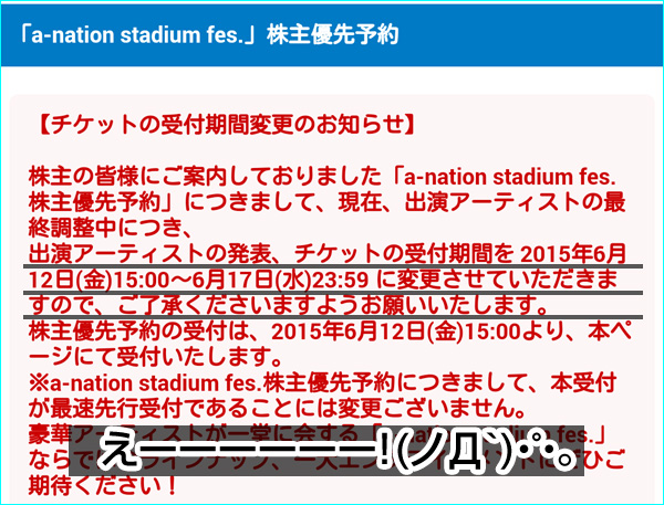 衝撃的なことが起きました・・・! 本来、本日発表だったはずの 楽しみにされていた皆様、すみません・・・。 今日は早起きをして「めざましテレビ」見てたのに・・・。 以下、avexからのコメントです。 −−−−−−−−− 【チケットの受付期間変更のお知らせ】 株主の皆様にご案内しておりました「a-nation stadium fes.株主優先予約」につきまして、現在、出演アーティストの最終調整中につき、 なお、a-nation island(国立代々木競技場第一体育館)でまだ解禁されていない8/1(土)、8/2(日)公演に関しましては、こちらも最終調整中となっております。 −−−−−−−−− 発表まであと1週間。 1週間待つのだから、きっと大物アーティストと交渉中のはず! 期待しましょう!