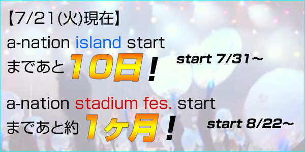 ついに今年も梅雨明け! 本格的な夏に入りました! そしてa-nationもあと10日後にはスタート! もう、来週の週末からa-nationがスタートします! 渋谷を舞台に繰り広げられる「非」日常空間を そして、stadium fes.も1ヶ月後にスタート! まだチケットゲットできていない方も チケット情報をくまなくチェックしてくださいね! 7/23追記 そして、今年は会場に行けなくても、