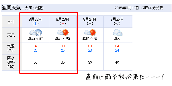 a-nation 2015 大阪公演1日目!会場実況中継します!天気予報 8/22 9:00更新 ついに、stadium fes.大阪が、開催されます! 両日とも可能なかぎり、毎年恒例の「実況」していきます! ただ、このページはパソコンで作っているので、 そのため、土・日の朝からライブ終了後までは特別体制!! 直前になって、土曜日の天気が怪しくなってきてますが、 8/22 9:00更新 それでは「a-nation stadium fes.」、楽しみましょう〜♪
