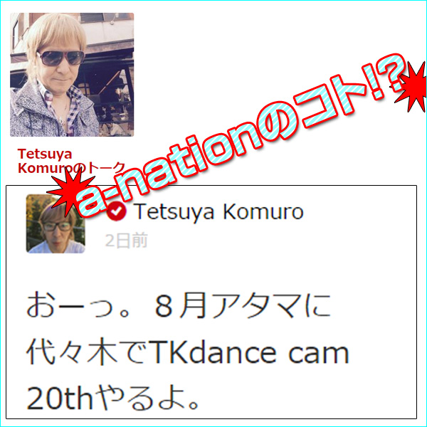 a-nation island(渋谷で行われるタウンフェス)で これは今、Twitterで流れる噂です。 ソース元は、「755」の小室氏からのメッセージです。 それによると、 『おーっ。8月アタマに とコメントが書かれています。 「TK DANCE CAMP」とは1995年に開催された a-nationの原点とされるイベントで、 今年(2015年)は20周年になるため、 8月頭で代々木(渋谷)となれば・・・ そう、a-nation開催期間中で同地域です! 予想になりますが、 1995年の「TK DANCE CAMP」は、 8月19日に大阪、8月26日に東京で公演していたということなので、 今年8月頭に開催されるであろう「TK DANCE CAMP 20th」は、 公式発表が楽しみですね! これから様々なところから情報が入ってくると思います。 新しい情報が入り次第、このページでまとめていきます。