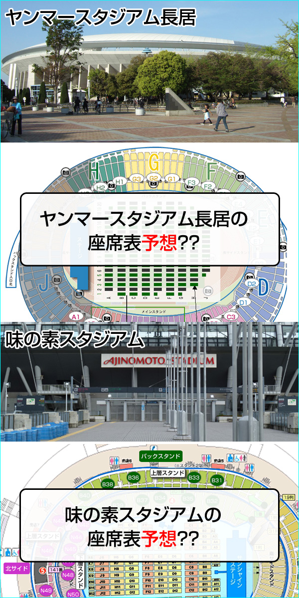 ■大阪公演も情報多数!当日までにチェック! 強縮ながら、大阪公演の出演順を予想してみました! 開幕直前の「ヤンマースタジアム長居」 事前に知っておいたほうが良いポイントをまとめてみました! 初めて来る人もわかりやすい >> 「ヤンマースタジア長居へのアクセス&グルメ情報解説ページ」へ! 「グッズを確実に買えるにはいつ行けば良い?」など そして、座席表の予想もしています!