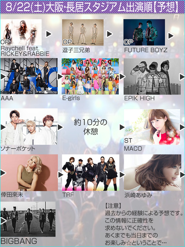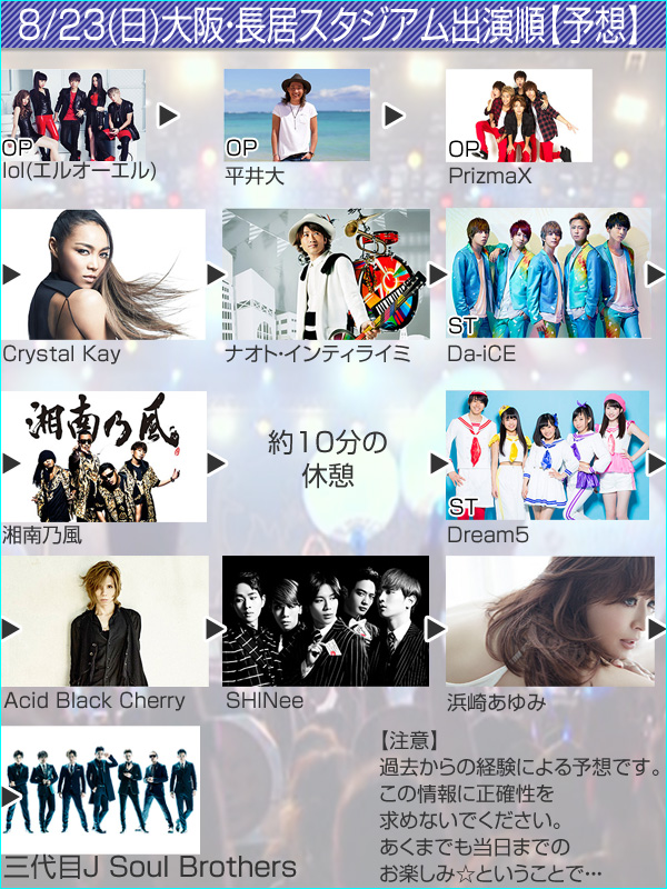 a-nation 2015 恐縮ながら、大阪公演出演順予想!ついに、8月22日から「a-nation stadium fes.」 きっと、皆さんが気になっているだろうこと、 誠に恐縮なのですが、試しに「大阪公演」の出演順を なんか、この作業は楽しかったので、 ※注意※ ※これは主催者が発表したものではありません。 では、大阪公演の予想順序をどうぞ〜