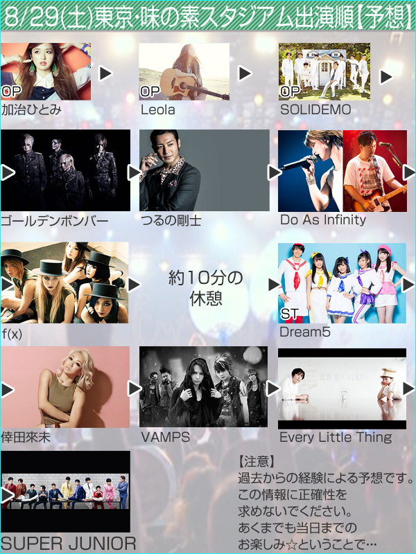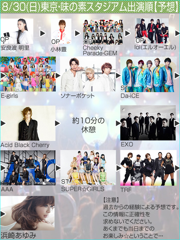 a-nation 2015 懲りずに東京公演出演順予想!ついに、8月29日から「a-nation stadium fes.」 きっと、皆さんが気になっているだろうこと、 誠に恐縮なのですが、試しに「東京公演」の出演順を 大阪公演も出演順予想していましたが、 大阪公演の流れも踏まえて、 なんか、この作業は楽しかったので、 ※注意※ ※これは主催者が発表したものではありません。 では、東京公演の予想順序をどうぞ〜