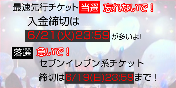 stadium fes.最速先行チケット、当選された方、おめでとうございます!しかし、油断してはいけません! 入金締切が6/21(火)23:59までと近づいていますよ(一部除く)! 入金遅れると無効になるので、入金忘れずに! そして、落選した方はまだ諦める必要はありません!セブンイレブン系でチケット発売中です!まだ良席期待できます! セブンイレブン系も締切が6/19(日)23:59までと迫っています。この記事を更新している19時ころから数えるとあと5時間しかありません!すぐに申し込みしましょう! セブンイレブン系が終わったら、次は公式HP先行予約になるでしょうか?まだまだチケット争奪戦は続きます。 セブンイレブン系チケットを含む「stadium fes.まとめページ」はこちら!