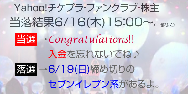 皆さん、Yahoo!チケットプラス、ファンクラブ、もしくは株主で先行チケットの抽選を申し込みましたでしょうか? そのチケットの当落結果が6月16日(木)15時に発表されます!(一部除く) 祈りながら申し込んだチケット、当たりましたでしょうか? 当たった方はおめでとうございます!入金を忘れずにしてくださいね。せっかく当たったチケット、無効になってしまいますよ。 そして、残念ながら落選された方、大丈夫!今、セブンイレブン系で先行チケットの申し込みが始まっています。しかも、締め切りが6月19日(日)※!間に合います! そして、当たった方も当たらなかった方も、ぜひ下の投票にご投稿ください! セブンイレブン系チケットを含む「stadium fes.まとめページ」はこちら!
