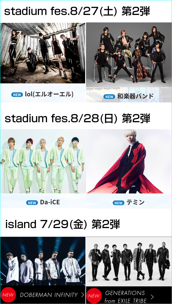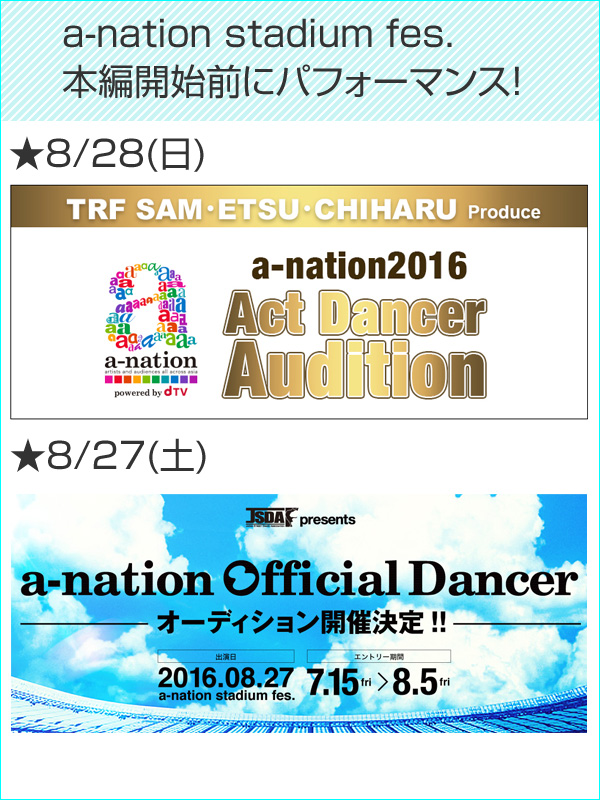 a-nation stadium fes.本編開始前の恒例イベント、「アクトダンスステージ&オフィシャルダンスステージ」の詳細が発表されています! ダンサーにとっての夏のビッグイベントですね〜。5万人という会場でパフォーマンスするのはめったにない機会なので、応募する方も多いようです。またレベル高いです! 27日(土)、28日(日)と異なるオーディションになるので注意してくださいね。 また、28日はオープニングだけでなく、TRFの「あの曲」で盛り上がっている時にもパフォーマンスできるようですよ! 応募はこちらから! 28日(日):TRF SAM・ETSU・CHIHARU Produce a-nation2016 Act Dancer Audition→ 詳細・エントリー 「a-nation」はオープニングアクト・アクトダンスステージも見応えあります!最初の「オープニングアクト」から最後の「ヘッドライナーアーティスト」まで楽しみましょう〜! stadium fes.についてのまとめは「stadium fes.まとめページ」へ! a-nation 2016 stadium、island追加アーティスト!2016年6月23日(木)にstadium fes.の第2弾アーティストが発表されました! BIGBANGがヘッドライナーの8月27日(土)公演には、lol(エルオーエル) 、和楽器バンドが追加/浜崎あゆみがヘッドライナー・AAAがサブヘッドライナー(?)の8月28日(日)公演には、Da-iCE、テミン(from SHINee)が追加されました! 8月27日(土)・28日(日)とも8組のアーティストが発表されました。 時間的なことを考えるとメインアーティストは8組くらいが限度だと思いますので、残りはシューティングアクトとオープニングアクトの発表だけかもしれません。 でも、今年は去年よりも30分早くスタートします。もしかしたらもう1〜2組くらいメインアーティストが発表されるかもしれません! そして、islandの「音祭り2016」はDOBERMAN INFINITY、GENERATIONS from EXILE TRIBE、オープニングアクトで、Leolaの出演が決定しました!