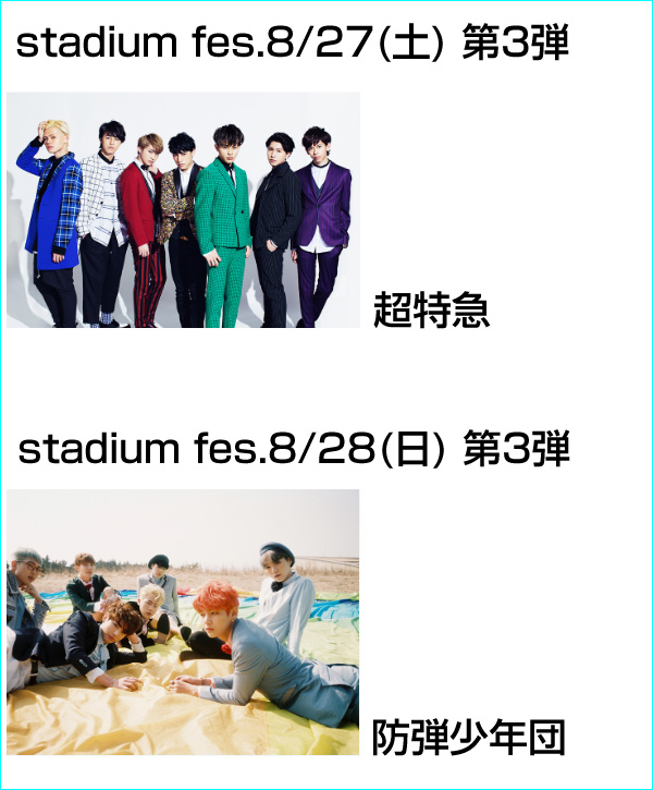 2016年7月4日、第3弾アーティストが発表されました! 8/27(土)公演に超特急が、8/28(日)公演に防弾少年団が追加されました! 8月27日(土)・28日(日)とも9組のアーティストが発表されました。 時間的なことを考えると、あとはオープニングアクトとシューティングアーティストの発表となるでしょう。 しかし、まだ、もしかしたら、あと1組のメインアーティストの発表があるかもしれませんよ! また、7/6に公式HP先着の先行チケットが発売されましたが、8/27(土)は完売になっております。 stadium fes.についてのまとめは「stadium fes.まとめページ」へ!