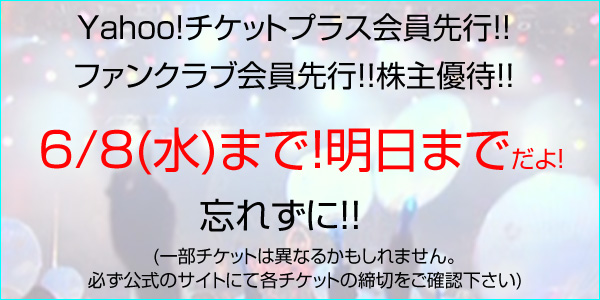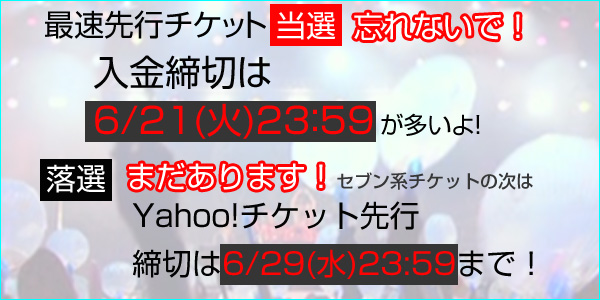 stadium fes.最速先行チケット、当選された方、おめでとうございます!しかし、油断してはいけません! 入金締切が6/21(火)23:59までと近づいていますよ(一部除く)! 入金遅れると無効になるので、入金忘れずに! そして、セブンイレブン系チケット先行の次はYahoo!チケット先行が開始されています。まだ良席の期待できる先行チケットです。あきらめずにチェックしましょう! Yahoo!チケットを含む「stadium fes.まとめページ」はこちら!