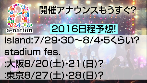 a-nation 2016 開催決定!大阪は開催されず・・・!2016年5月17日(火)午前0時に、公式サイトにて今年の「a-nation」の開催アナウンスがありました! 関西の人には大いに気になる(!?)大阪・ヤンマースタジアム長居での「a-nation stadium fes.」開催の件ですが、やはり今年は開催がないようです・・・。 5月17日の正式発表だったので、5月16日の裁判結果によって動きがあるのかな、と思っていましたが、結局は大阪・ヤンマースタジアム長居での開催アナウンスはありませんでした。 ・・・と、いうことで関西に住んでいる僕は残念ですが、公式サイトにて発表された概要をまとめたいと思います。