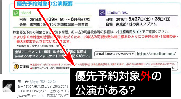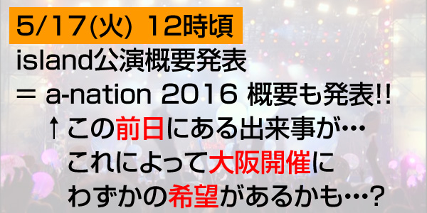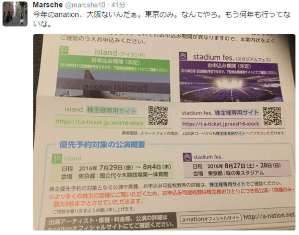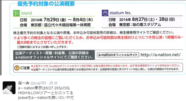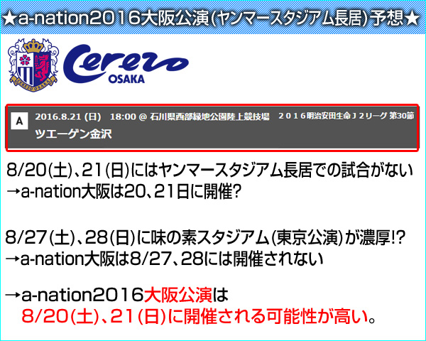 a-nation 2016 【希望】大阪公演のわずかな開催アリの可能性!?昨日5/12、株主優待チケットの案内からわかった、「a-nation 2016」の開催日程案内。 そこに驚いたのは「大阪公演の開催のアナウンスが無かった」ことです。 がっかりされた方も多いと思いますが、もしかしたら、ほんのわずかだけど、「大阪・ヤンマースタジアム長居での公演って開催される可能性もある」のではないか、という情報を見つけました!