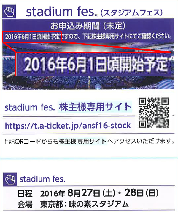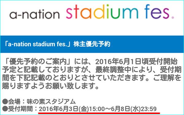 こちらは株主優待チケットページですが、そこには 受付期間が【2016年6月3日(金)15:00〜】と書かれています。 そうです! ついに!ついに! 「stadium fes.」の出演アーティストが6月3日(金)に発表されるようです!! 2年前は早朝の発表だったらしく、 今年も早朝発表の可能性もあり、 そして、チケットの獲得合戦がスタートします。どんなアーティストが出るのか!?気になっているアーティストは出る!? Twitterなどで「出る、出ない」色々出ていますが、それは実際に公式HPから発表されるまで分かりません!