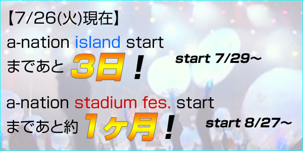 ●「a-nation island」 ●「a-nation stadium fes.」 「island」「stadium fes.」2タイプのイベントがありますが、やはり注目されるのは「stadium fes.」のほうですよね。それがついに今年は2日間のみ・・・となるのは少し寂しい気持ちにはなりますね〜〜〜。 その分、この2日間はみんなが驚くビッグアーティストが出ることに期待!!
