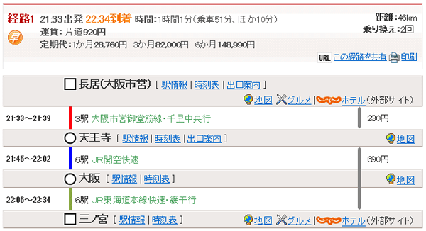 長居21:33→(地下鉄御堂筋線・千里中央行)→梅田21:55