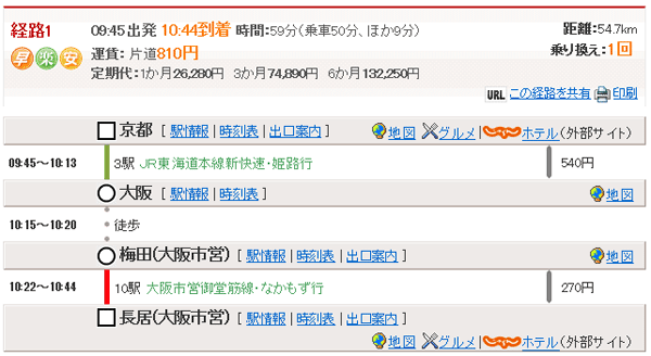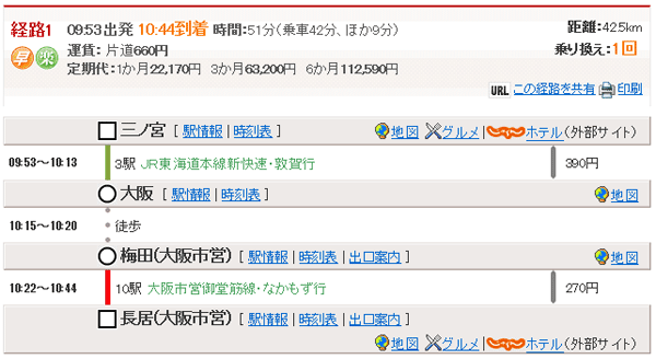 梅田10:22→(地下鉄御堂筋線・なかもず行)→長居10:44 |