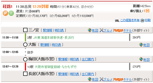 三ノ宮11:38→(JR東海道本線新快速・長浜行)→大阪11:58