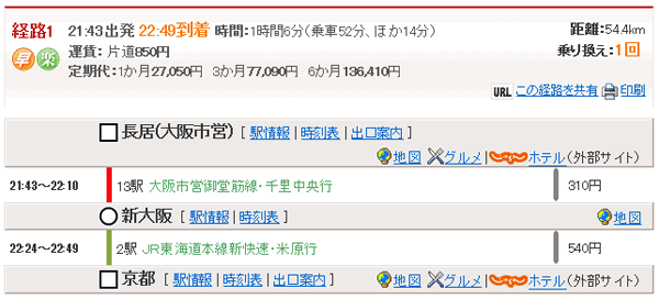 長居21:43→(地下鉄御堂筋線・千里中央行)→新大阪22:11