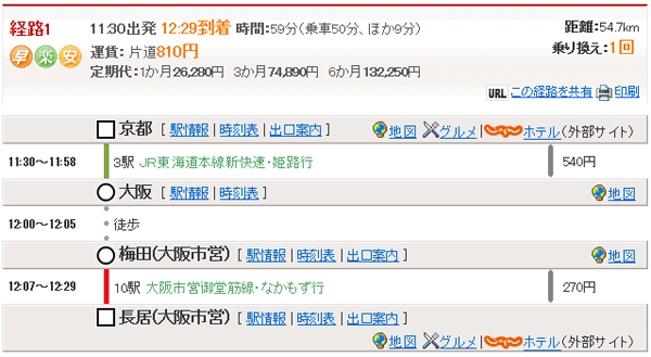 JR京都11:30→(JR東海道本線新快速・姫路行)→大阪11:58