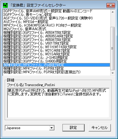 機種別設定で「MP4ファイル、iPod向け設定」をクリックして、設定ボタンをクリックします。