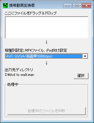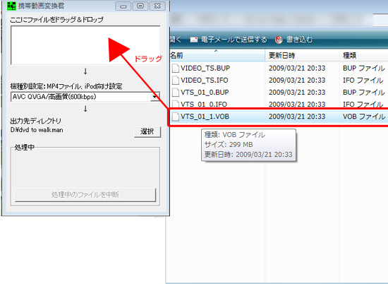 3.変換する方法(画質)を設定したあと、前ページで作られたVOBファイルを